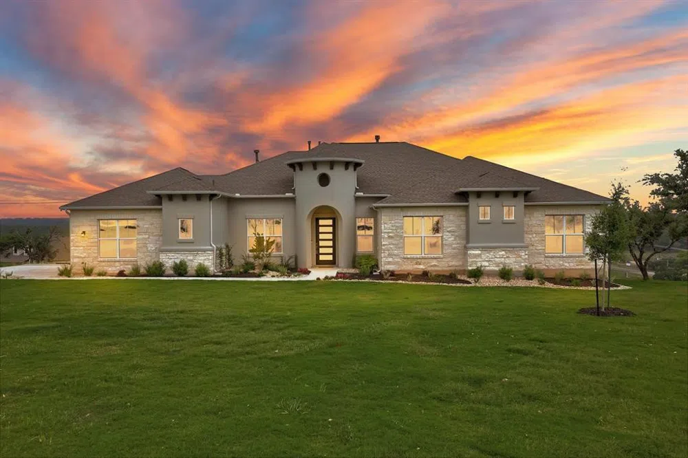 Welcome to 129 Pueblo Peak Cove, an exquisite 4-bedroom, 3-bath home on a sprawling one-acre lot, built by the renowned Scott Felder Homes and perfectly situated on an oversized, East-facing acreage homesite. Boasting over $210,000 in luxurious upgrades, this residence exudes elegance and functionality at every turn. Step inside to discover custom features such as a luxurious master suite with custom-built shelving in the closet, an expansive family room that seamlessly connects to an oversized patio with a full kitchen, a stunning stained wood ceiling, and sliding doors for perfect indoor-outdoor entertaining. The open-concept kitchen is a chef's dream, featuring a custom island with ample storage. Enjoy meals in the extended breakfast area, formal dining room, or utilize the additional study space for work or leisure. Designed for versatility, the home includes a large game room and a private mother-in-law suite with a walk-in shower. Situated at the top of a hill in a peaceful cul-de-sac, this home offers breathtaking sunset views. Additional features include a three-car garage with side entry and windows, ensuring plenty of space for vehicles and storage. Located in an exclusive neighborhood of roughly 150 homes, this property offers a private retreat with convenient access to Highway 183 and nearby shopping. Don't miss the opportunity to own this beautifully upgraded home with unparalleled features and stunning views