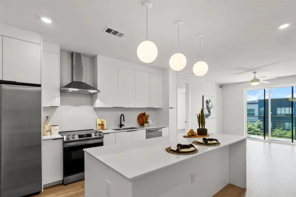 Welcome to the brand new Parkside at Mueller Condos. Located right next to Mueller Lake Park and in the heart of the Aldrich District with so many restaurants and entertainment options all at your doorstep, this 2-bedroom, 2-full bath features a spacious 1,162 SQ FT of space. Coming into the kitchen and you're greeted by the oversized island with Carrara marble-style quartz countertops and modern white cabinetry finished off by matte black handles and hardware. A full Samsung appliance package is ready for those homecooked meals while the open floorplan is great for entertaining guests. The same Carrara marble-style quartz countertops and matte black handles and hardware carry over into both bathrooms but add a pop of color with grey and baby blue cabinets. Stretch out with the primary bathrooms dual vanities and walk in shower, while the spacious closet is ready to house all your apparel. There are so many amenities to enjoy within the building! Get a workout at the fitness center with Peloton Bikes or lounge in the Clubhouse. Grab a cabana at the resort style pool while you grill at the outdoor kitchen. Then wrap up by the firepit on the rooftop terrace featuring breathtaking views of Mueller Lake and downtown Austin.