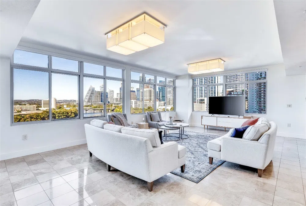Fully furnished Penthouse unit at the Milago available immediately for lease! Unobstructed 180-270 degree gorgeous views in all directions and easy access to Lady Bird Lake hike and bike trail, easy access to paddle boards and kayaks just below the unit. Walking distance to all things Rainey and Downtown. This large (2400+ sq. ft.), 2 bedroom, 2.5 bath + Den/Office really impresses with its remodel upgrades, high quality furniture, and windows in every direction. Fully automated shades. Easy approval and move-in process. Milago is a wonderful mid-rise building. Milago charges small admin fee for setting up key fobs, etc. 2 pets max. $500/per pet deposit + Cleaning Fee at end of lease. Owner seeking 12+ month term.